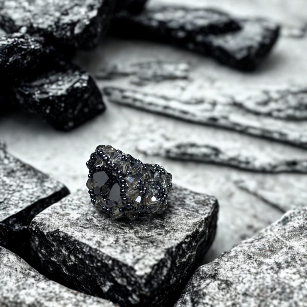 💎 Hecho a mano con cristales grises ahumados y detalles metálicos,